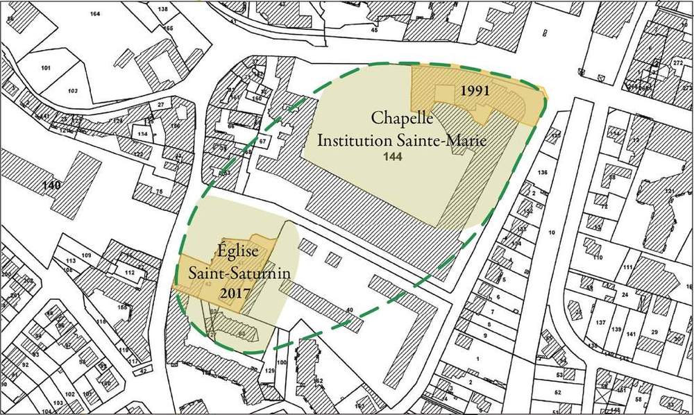 Ce cimetière paroissial concorde chronologiquement avec d’autres tombes mises au jour, en 1991, près de l’Institution Sainte-Marie. La coexistence de deux pôles d’inhumation spatialement très proche pourrait induire une extension de l’espace funéraire, ce que laisserait entendre le toponyme de Grand cymetière apparaissant sur des plans du XVIIe s. pour la parcelle de l’Institution.