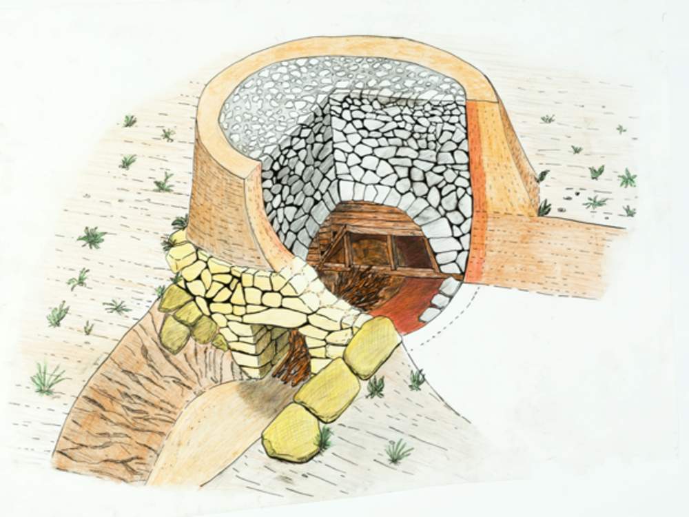 Creusé dans le sol, le four de Guerville est composé de deux fosses : une fosse circulaire destinée à la combustion des pierres et une aire de chauffe rectangulaire servant à l’alimentation du feu. Les parois de la fosse circulaire sont doublées par des pierres sèches (meulière et calcaire) afin de supporter la charge des blocs de calcaire à brûler.