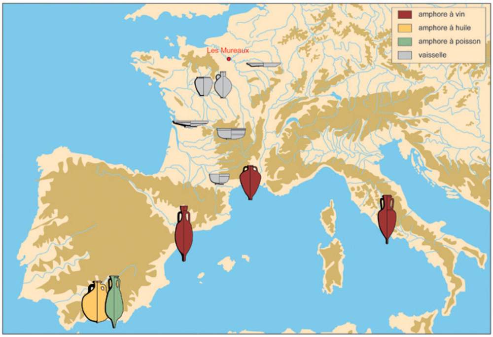Au-delà des structures portuaires, le mobilier archéologique retrouvé fournit des éléments d’information sur le type et l’origine des marchandises qui transitaient par le site. Bien que les denrées aient disparu (produits périssables), les contenants avec leurs formes spécifiques (amphores) nous renseignent sur ce qu’ils transportaient : huile, vin, préparations de poisson,… et sur leur origine (Italie, Espagne, sud de la France). De même, différents types de vaisselle (coupes, assiettes, cruches, pots) retrouvés sur le site sont issus d’un commerce d’assez longue distance.