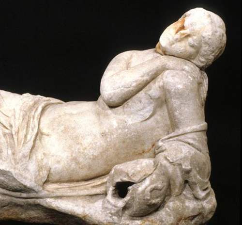 La tête d’une statue en marbre blanc a été retrouvée dans le comblement du bassin. Le reste du corps, représentant celui d’une nymphe (déesse des sources), a ensuite été repéré dans des niveaux de destruction. Cette sculpture était conçue à l’origine pour être vue au sol ; elle semble avoir été amputée de ses pieds pour être installée dans la niche du temple par la suite. Sa présence identifie le bâtiment comme un nymphée, mais son système hydraulique complexe permet de l’interpréter comme un véritable sanctuaire de source organisé autour d’une résurgence d’eau (cf. article sur la nymphe).