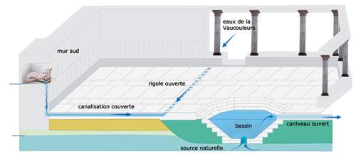 L’édifice a été bâti à la fois sur une source naturelle et utilise de l’eau canalisée provenant de la colline, à l'aide d'un système de tuyaux en plomb. Ainsi, dans le mur sud, une niche avec un petit bassin quadrangulaire reçoit l’eau acheminée par tuyau provenant des bassins situés dans le flan de la colline. La circulation se poursuit avec une canalisation en plomb intégrée au mur et qui rejoint un caniveau transversal (rigole), divisant ainsi le bâtiment en deux espaces de surface équivalente (pièces nord et sud). Cette rigole est aussi alimentée par les eaux de la Vaucouleurs canalisées à l’ouest.