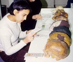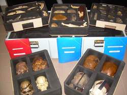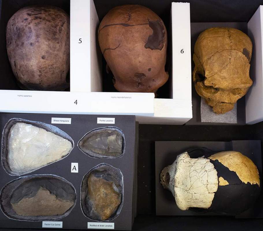 • 9 moulages de crânes, parmi les plus célèbres fossiles découverts (Toumaï, Lucy, Georgicus, l'homme de Tautavel, Neandertal…), permettront d'observer les différences morphologiques et de les comparer à notre espèce, représentée par le moulage de l'homme de Cro-Magnon. Ces moulages, munis de socles, sont accompagnés de fiches d'identités détaillées.