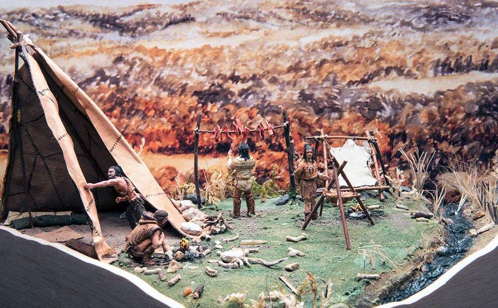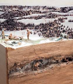 Cette maquette composée de 3 vues distinctes est inspirée de découvertes archéologiques en Île-de-France et en France. Elle représente trois scènes de vie au temps des Magdaléniens : la chasse d’un renne, une grotte ornée et le campement d’une famille.