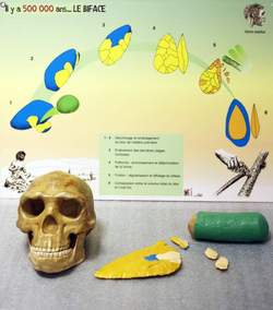 • 31 moulages et objets expérimentaux d'outils, de mâchoires d'animaux et d'objets façonnés depuis les plus anciens en Afrique (-2,5 Ma) jusqu'aux plus récents, à la fin du Paléolithique en France. Les outils sont à associer aux différentes espèces représentées par les crânes. Chacun possède sa fiche d'identité, illustrée de schémas techniques ou de dessins explicatifs.