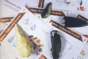 Des dossiers documentaires accompagnent les moulages de crânes et d'outils (fiches d'identité des individus et des animaux + fiche pour chaque outil), ainsi que des ouvrages.