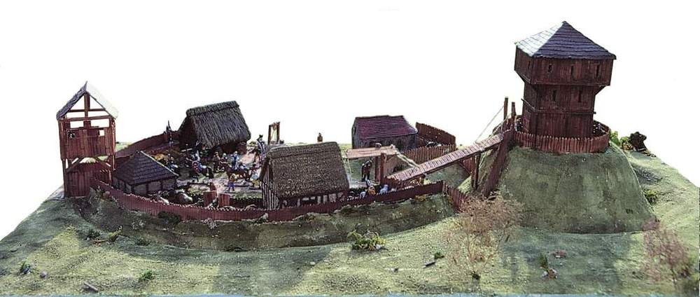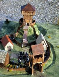 Une fortification en bois (tour, fossé et palissade) protège une communauté paysanne et des artisans qui dépendent ainsi d’un seigneur. Ces "châteaux à motte" sont également appelés "mottes castrales".