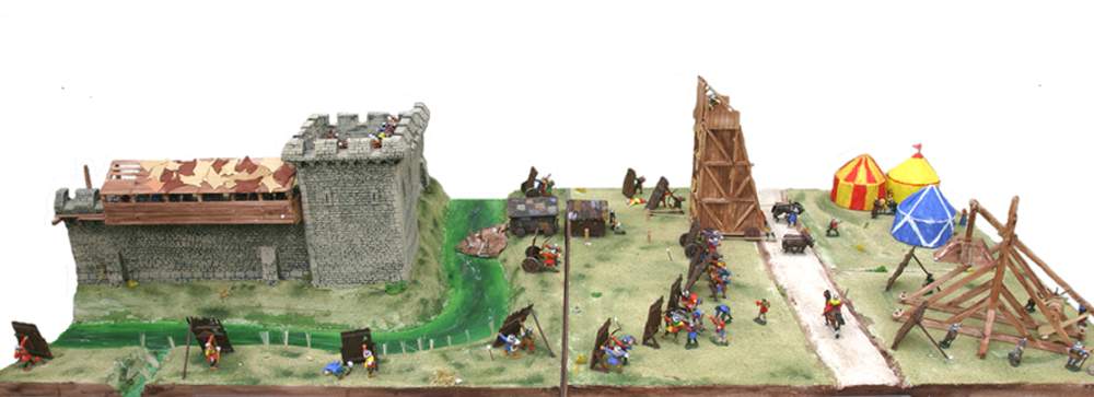 Ces 4 maquettes (modules) illustrent la vie d’une seigneurie au XIVème siècle. Elles représentent différents aspects de la vie quotidienne dans une période de conflit : l’attaque et la défense d’un château-fort (engins d'assaut), les pouvoirs d’une seigneurie (rendre la justice, le droit sur l’utilisation du moulin, le droit de péage), l’agriculture et les ressources alimentaires en général.